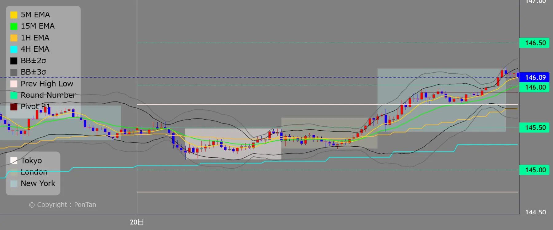 The PonTan chart shows price movements over a five-day period, including the day recorded in the logbook. Only the 15-minute chart is displayed. The mouse wheel can be used to zoom in and out, and left and right scrolling allows you to go back and check past price movements. The vertical line indicates the date line and is always visible, but the date at the bottom may be omitted depending on the zoom factor. Charts for the day of the logbook are automatically updated every 15 minutes. When the date changes, only the chart corresponding to that day's logbook is subject to subsequent updates, while charts for other dates are fixed. This is intended to "keep a history of the charts you were looking at in real time that day".